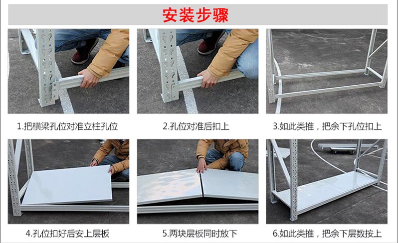 3、層板有木板和鋼板可供選擇,立柱高度設(shè)有每50mm調(diào)節(jié)孔距,可根據(jù)貨物高低調(diào)節(jié)層間使用。
